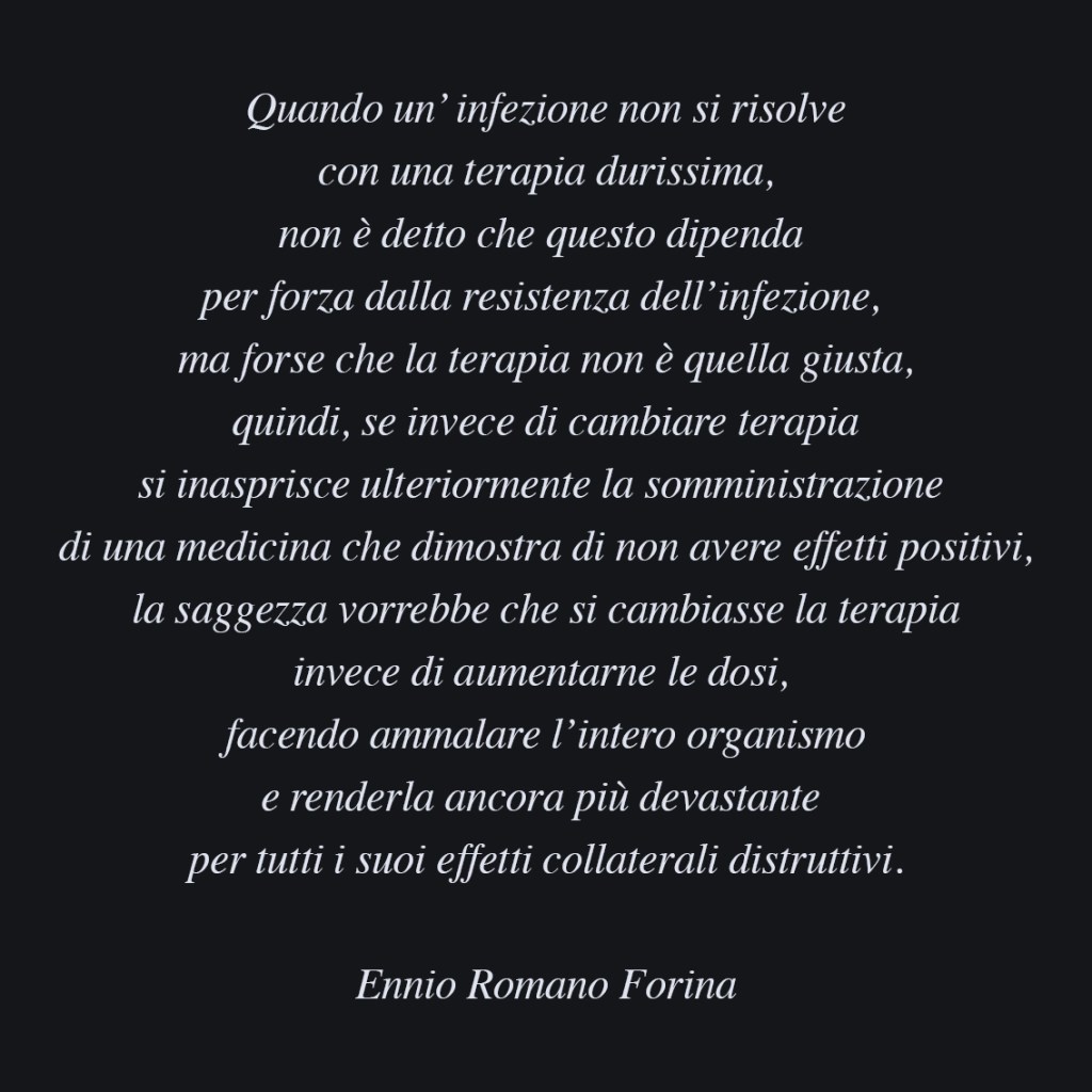 Penso che i danni collaterali della gestione globale di questa epidemia multipla potrebbero avere effetti peggiori persino di quelli dell’epidemia stessa, se considerati anche a lungo termine. Io la chiamo così: “epidemia” multipla, non pandemia, di pandemico c’è la realtà di una globalizzazione imposta non si sa da chi, altrettanto insana quanto questo virus, uno dei tanti, attivati dai nostri giochi di onnipotenza, globalizzazione che forse è anche alla base degli eventi che stiamo vivendo.
