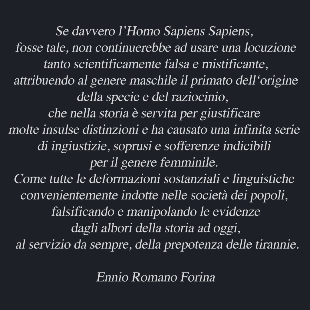 Io penso che evidenziando l’inconsistenza di molte asserzioni concettuali e linguistiche troveremmo le motivazioni artefatte ed abbiette della gran parte dei conflitti e degli abusi umani contro il mondo vivente e contro la propria specie che sono ben documentati nella storia di questo animale che si fregia del titolo “sapiens”, mentre all’esame dei fatti, la sua natura e le sue attitudini hanno dimostrato di non esserlo affatto. Tutte le invasioni e gli imperialismi, tutti i soprusi, le guerre e le prepotenze dei singoli e dei popoli, hanno trovato da sempre le giustificazioni più false, siano esse state religiose, etniche, scientifiche, nazionalistiche, ideologiche, non importa quale forma le falsità assumano, la matrice è la stessa: ignorare il vero e costruire simulacri ai quali credere ciecamente e obbedire.Se mai l’umana specie potesse a ragione chiamarsi “Sapiens” questa definizione sarebbe comunque appropriata per il genere femminile, non per quello maschile. Tuttavia o purtroppo, nessuno dei due generi ha mai davvero dimostrato nella storia di voler perseguire la saggezza prima di tutto, la sapienza scientifica è un’altra cosa. Bricioli di saggezza sono derivati ogni volta dalle devastazioni causate dalle falsità, create, nutrite e custodite ottusamente da ambedue i generi, dalle quali, in brevi intervalli di riflessione, poteva risaltare il pensiero evoluto di qualche anima illuminata che solo allora riceveva ascolto.Per questo, io credo che un grande salto evolutivo del genere umano che avrebbe il duplice effetto di inibire la sua attitudine prepotente e violenta a tutti i livelli, contro sé stesso e il mondo vivente, si può realizzare solo riconoscendo il labirinto di falsità che nei millenni ha guidato le sue azioni insane e lo ha fatto deviare dal sentiero della vera conoscenza a quello di una scienza puramente tecnologica e ben poco saggia.